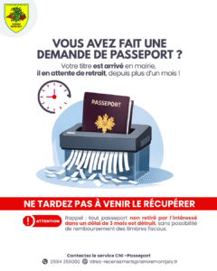 Le service CNI-Passeport de la ville de Rémire-Montjoly invite les usagers qui ont effectué une demande de passeport, il y a plus d’un mois à venir le récupérer dans les plus brefs délais.