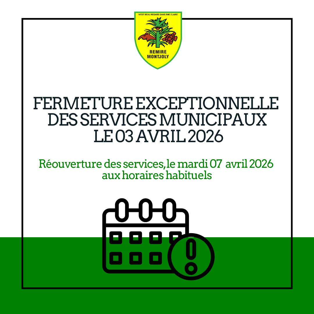 Il est porté à la connaissance des usagers que les services municipaux de la ville de Rémire-Montjoly seront exceptionnellement fermés, ce vendredi 3 avril 2026. La reprise des activités s’effectuera, le mardi 7 avril 2026 aux horaires habituels.