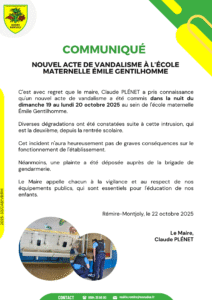 C’est avec regret que le maire de la ville de Rémire-Montjoly, Claude PLÉNET a pris connaissance qu’un nouvel acte de vandalisme a été commis dans la nuit du dimanche 19 au lundi 20 octobre 2025 au sein de l’école maternelle Émile Gentilhomme.