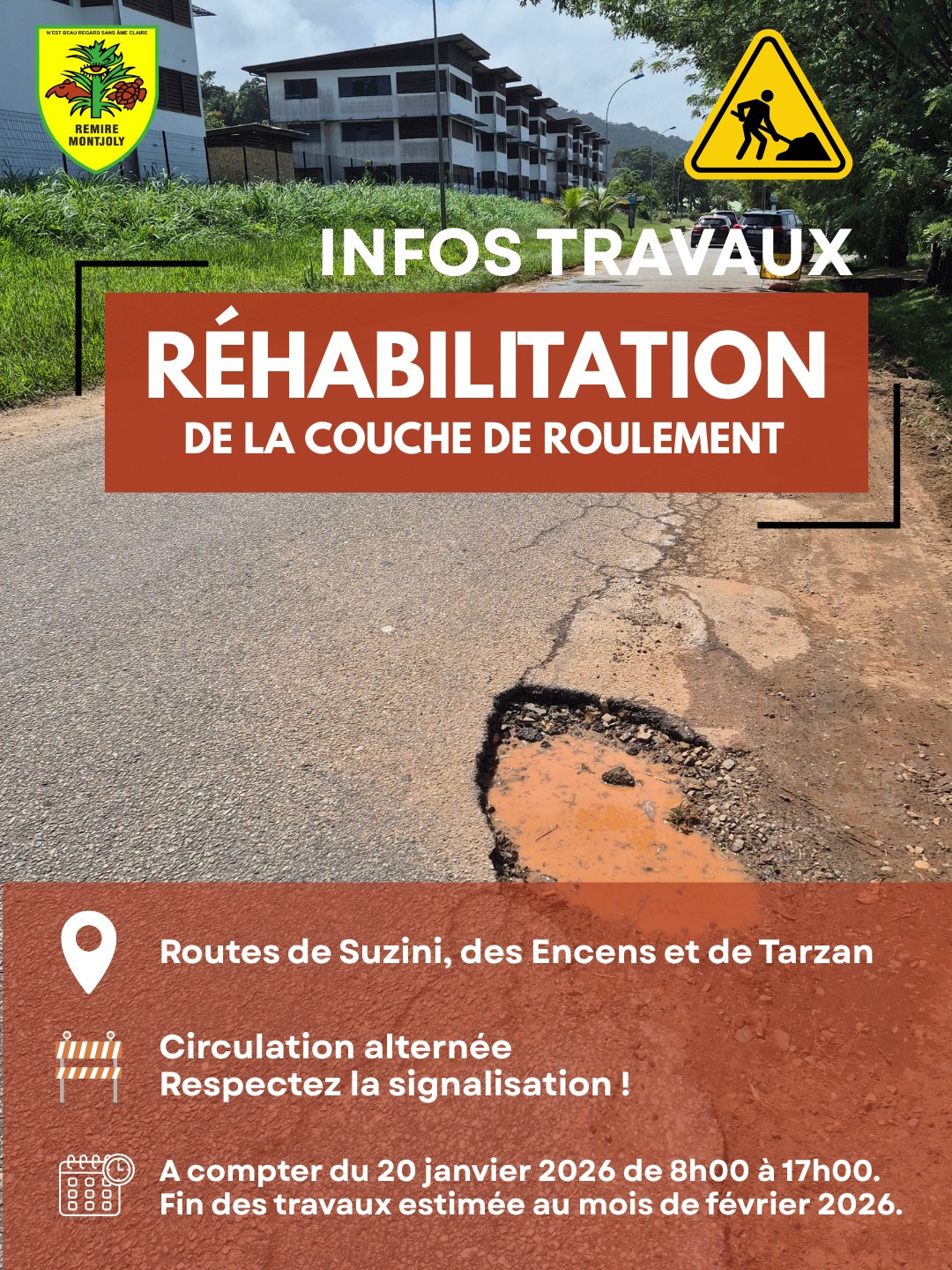 La ville de Rémire-Montjoly, en partenariat avec la ville de Cayenne, informe les usagers du lancement à compter du mardi 20 janvier de travaux de réhabilitation de la voirie pour les secteurs suivants :
